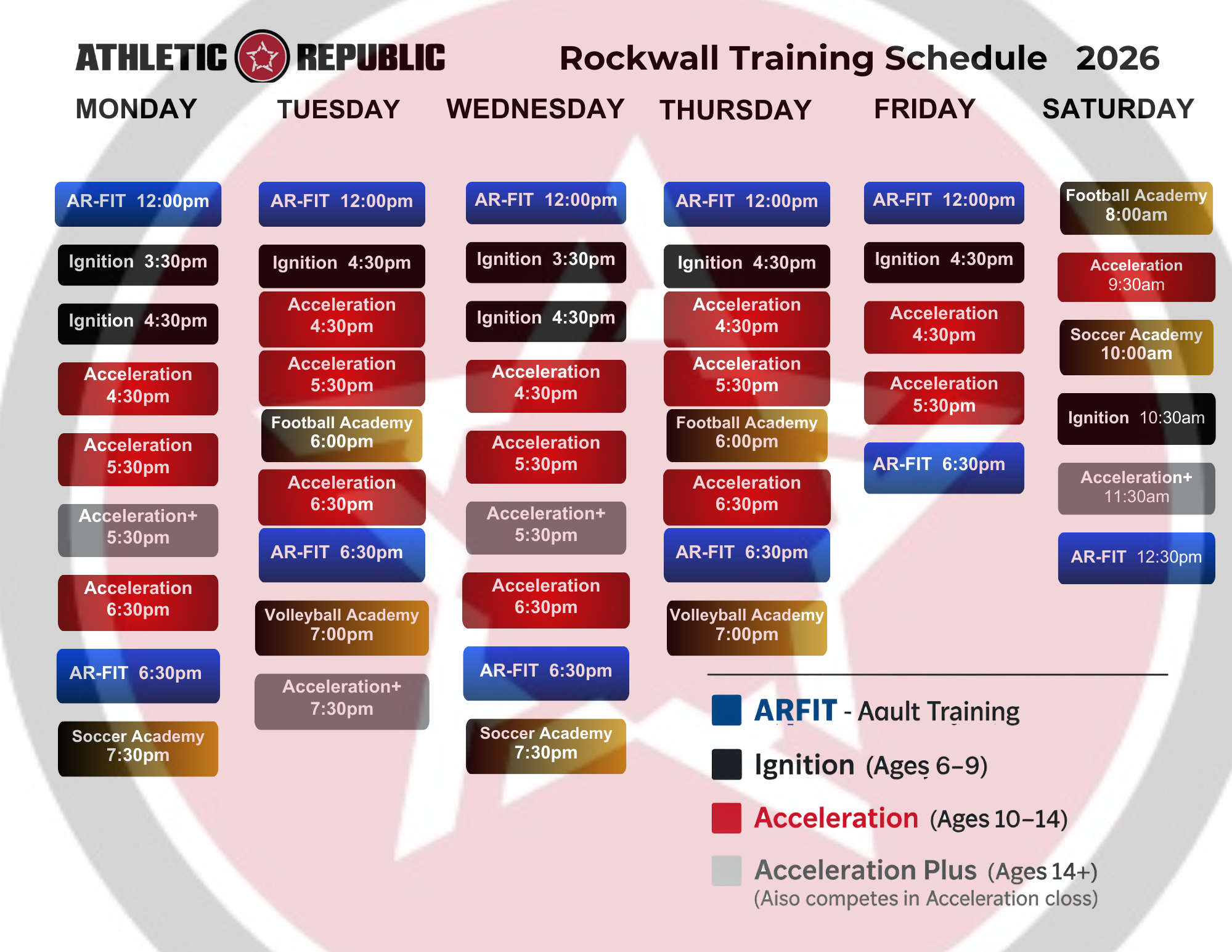 Below is our current weekly training schedule for the Rockwall location. This schedule outlines training times Monday through Saturday across our athlete development and fitness programs. Programs are age-based. Ignition (ages 6–10), Acceleration (ages 10–13), and Acceleration Plus (ages 14+). Call now to receive a free trial athlete assessment and be placed in the program that best fits you or your athlete. Sport-specific academies and AR-FIT adult classes are also available. Call now for pricing and availability.